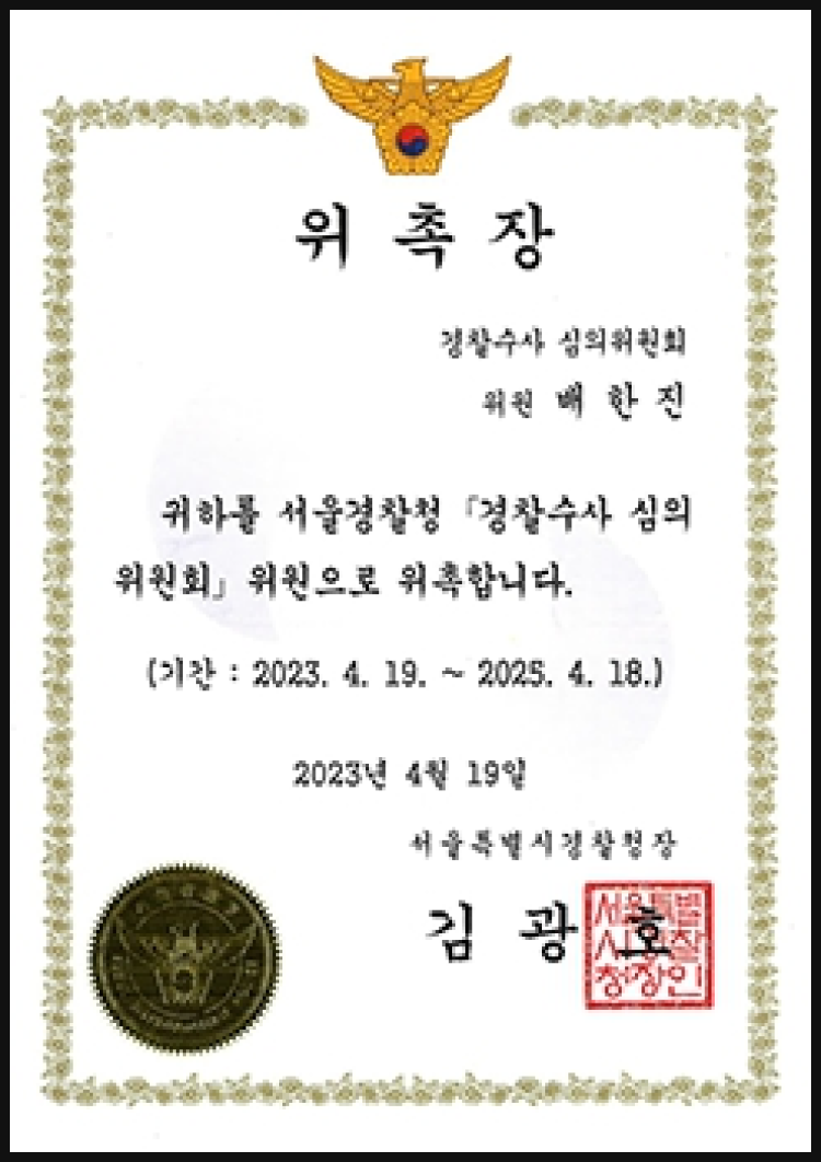 · 기관 : 서울특별시경찰청장 · 변호사 : 배한진