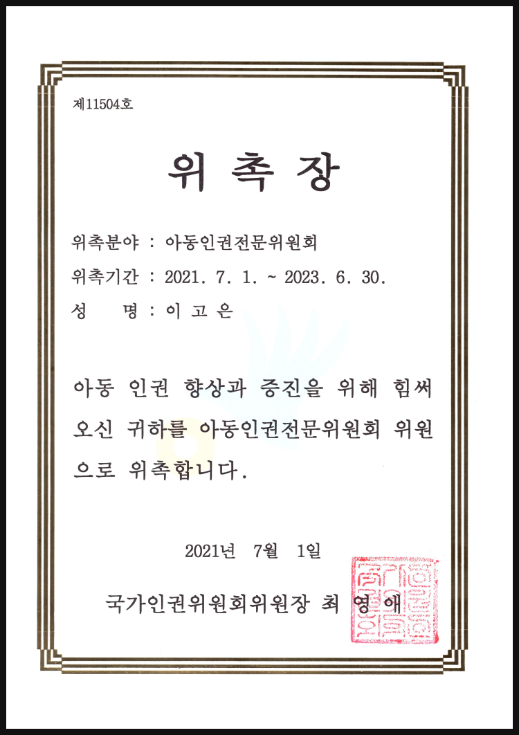 · 기관 : 국가인권위원회위원장 · 변호사 : 이고은