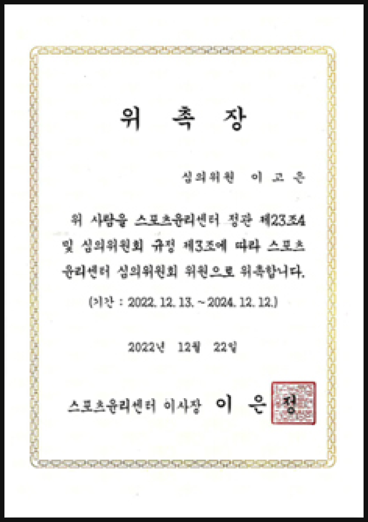 · 기관 : 스포츠윤리센터 이사장 · 변호사 : 이고은
